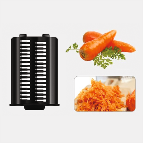 - издръжливият барабан с 5 сменяеми остриета от неръждаема стомана прецизно нарязва зеленчуците на филии или стърготини с различни размери