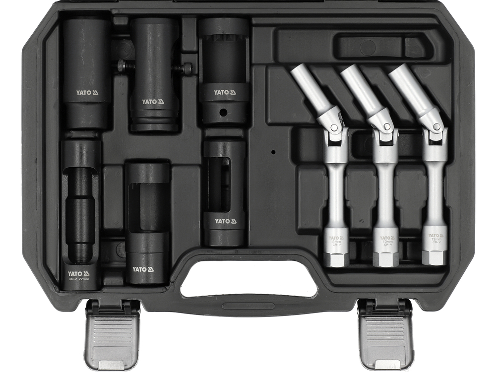 Комплект насадки за обслужване на свещи за предпалителници и инжекционни помпи в дизелови двигатели. Предназначен за работа на места с ограничен достъп, под ъгъл, например в тесни моторни отсеки.
