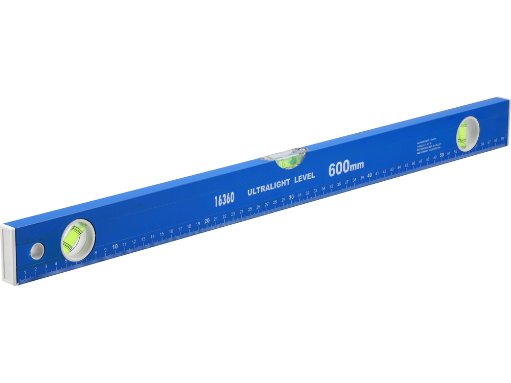 Vodováha z hliníkového profilu. Má tři libelly ukazující svislici, vodorovný úhel a úhel 45 stupňů. Milimetrová stupnice na tělese pro snadné vyznačení bodů na materiálu.
