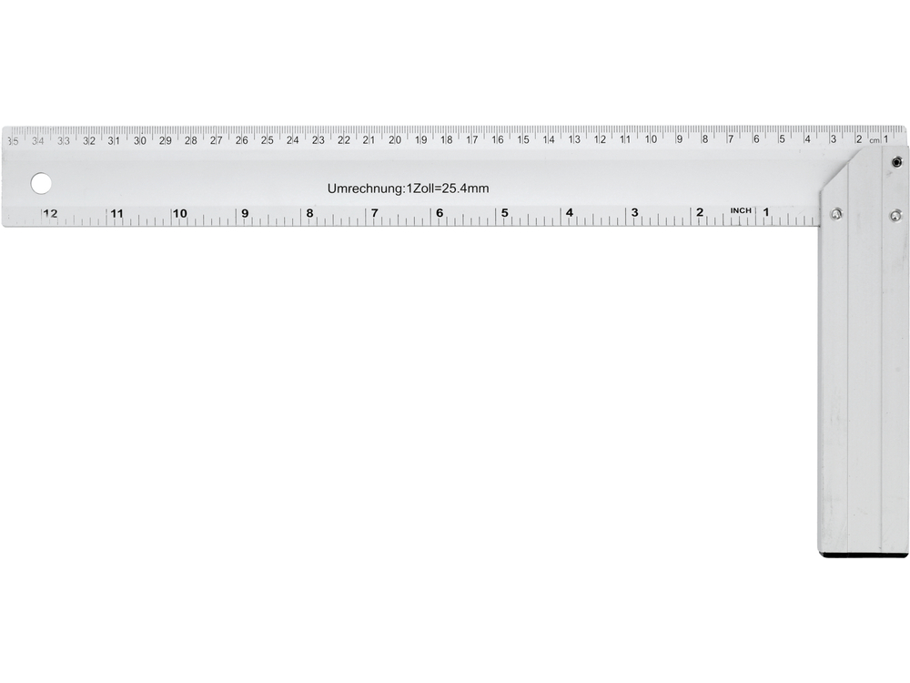 Úhlový držák s patkou je celý vyroben z tvrzeného hliníku, s čitelnými černými milimetrovými stupnicemi. Kloub mezi patkou a ramenem svírá úhel 45°.