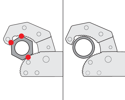 - horní čelist se speciálním tvarem háku spolu s profilovanou spodní čelistí zajišťuje tříbodový kontakt s odšroubovávanou součástí, což umožňuje práci jak s trubkami, tak se všemi druhy armatur, jako jsou matice a ventily.