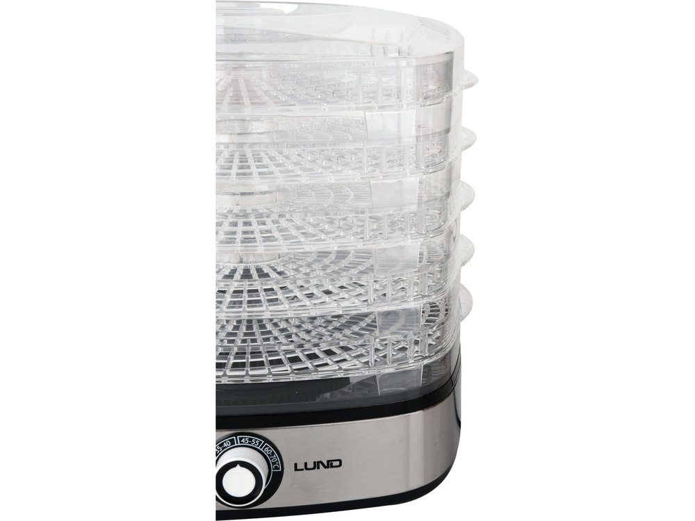 - Regulace teploty - možnost nastavení optimální teploty pro sušené produkty. Podrobné informace o čase a teplotě naleznete v příručkách. Ovoce se obvykle suší při teplotě kolem 60 °C, maso při 70 °C a zelenina při 50 °C.