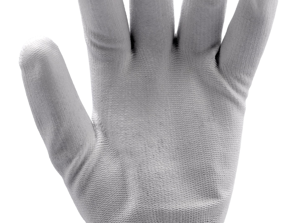 Ochranné pracovní rukavice z bílého nylonu, potažené bílým polyuretanem v oblasti úchopu. Silnější než obvyklý povlak a vysoce kvalitní polyuretan zajišťují nejvyšší odolnost proti oděru podle normy EN 388. Bezešvá konstrukce z vysoce kvalitního nylonu znamená zvýšenou odolnost proti roztržení a zachování pružnosti po delší dobu. Jemný steh 15G, tj. 15 stehů na palec, znamená nižší hmotnost a ještě lepší přilnavost k ruce.