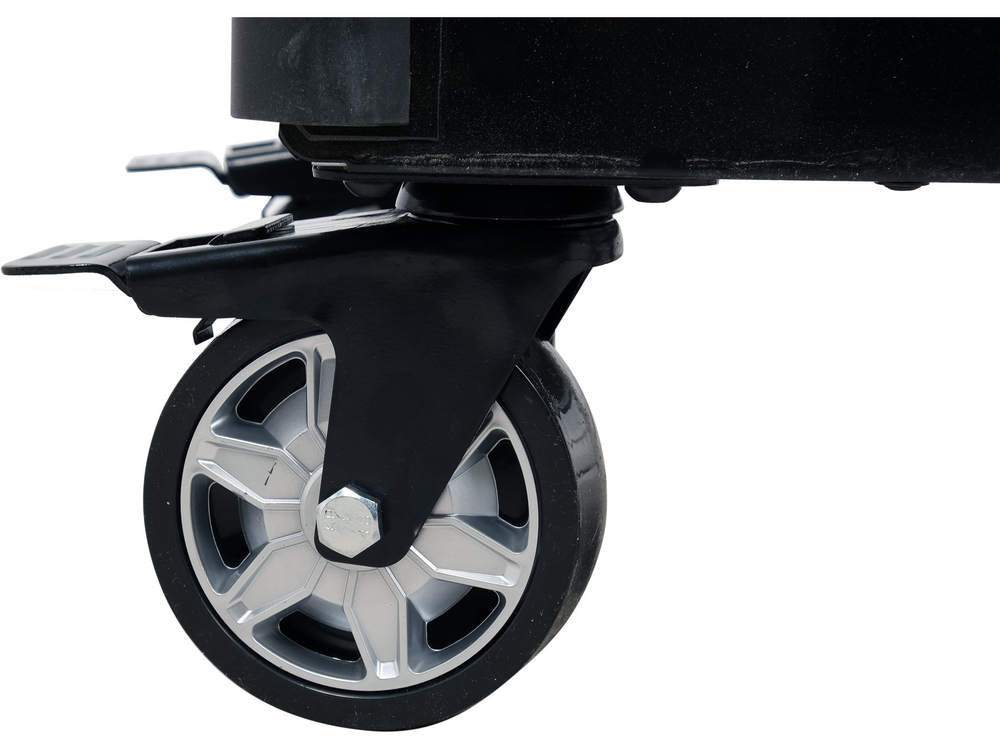 Box má také pevný kovový pracovní desku a pohodlnou rukojeť pro přesun boxu. Na bočních panelech je univerzální perforace umožňující další využití prostoru. Na rohových částech jsou elastické nárazníky bránící poškození.