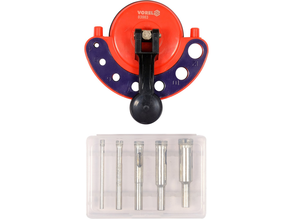 Vodítko, vrtací šablona pro vrtání do keramických dlaždic. Tělo z plastu odolného proti poškození. Vybaveno silnou gumovou přísavkou, průměr cca 100 mm, tloušťka cca 15 mm. Má vodicí otvory po obvodu, vyztužené kovovými kroužky fi 4 /5/6/7/8/10/12 mm. Součástí sady jsou také speciální trubkové vrtáky s diamantovým povrchem /diamantem potaženým/ hrotem.