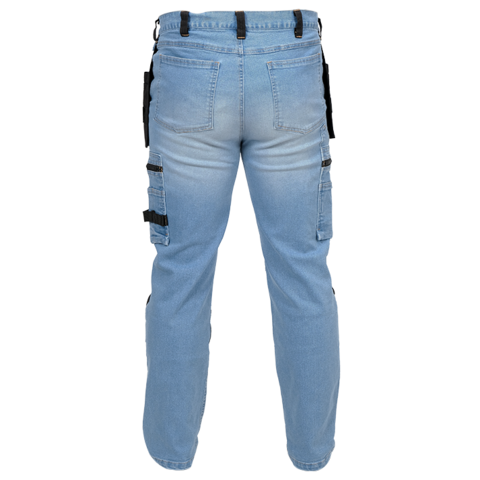 Pracovní kalhoty z elastické džínoviny jsou vyrobeny z odřené a elastické džínoviny s elastanem. Mají až 17 kapes, z toho 1 se zapínáním na suchý zip, 2 se zapínáním na zip a 2 odnímatelné montérské kapsy z odolného materiálu, které pomáhají organizovat práci tesaře, pokrývače nebo instalatéra.