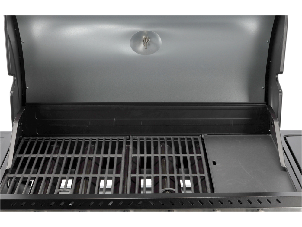 Plynový gril 6+1 s moderním designem, vyrobený z nerezové oceli a vybavený litinovým roštem. Boční police a prostorná uzamykatelná skříňka usnadňují ukládání koření a nezbytného příslušenství. Boční hořák o výkonu 2,2 kW umožňuje vařit a ohřívat jídlo v hrnci nebo pánvi.