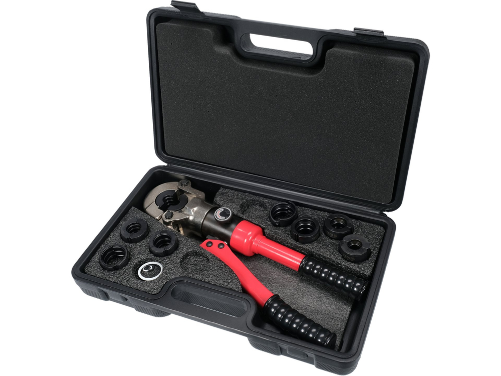Hydraulický ruční lis pro lisování tvarovek na trubkách PEX-AL-PEX, PERT-AL-PERT se sadou 8 lisovacích nástrojů. Je vybaven hydraulickým válcem, který umožňuje přesné a těsné upnutí šroubení lisovací silou 10 T. Systém rychlé výměny matric umožňuje snadnou výměnu matric.