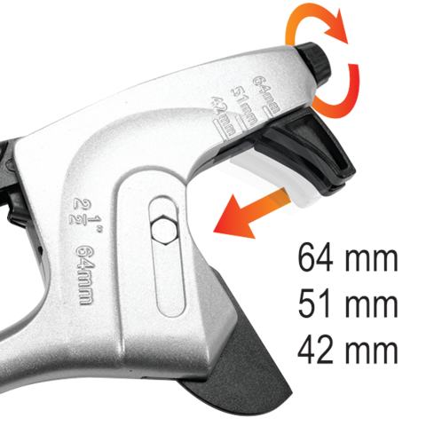 Nůžky na trubky pro stříhání trubek z PVC a jiných plastů (PP, PE, PU) a pesarů. Nastavitelný držák umístěný na konci nože pomáhá polohovat trubky o průměru 40, 50 a 63 mm, čímž zvyšuje efektivitu řezání. Vysoce kvalitní čepel z oceli SK5. Čepel s teflonovým povlakem pro lepší hladkost řezů. Nůžky používané pro instalatérské, montážní a stavební práce.