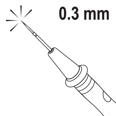 Měřicí sondy s ostrými mosaznými hroty se stříbrným pokovením. Průměr na konci sondy je pouhých 0,3 mm. Vodiče jsou vyrobeny z 80 pocínovaných měděných drátů. Kabely jsou pokryty pružnou silikonovou izolací, která je odolná vůči vysokým teplotám. Sondy jsou ideální pro měření malých součástek, např. na deskách plošných spojů chytrých telefonů. Bez problémů prorazí izolaci kabelu.