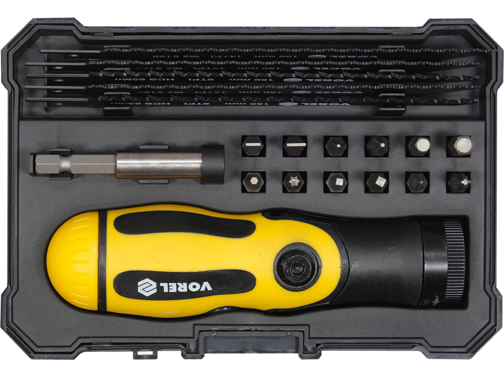 Držák pro bajonetové pilové listy a 1/4" bity. Rukojeť má kloub, který umožňuje práci v úhlu 45˚. Čepele se v držáku zajišťují otáčením kroužku. Držák bitů je magnetický. Uvnitř rukojeti je úložný prostor na bity.