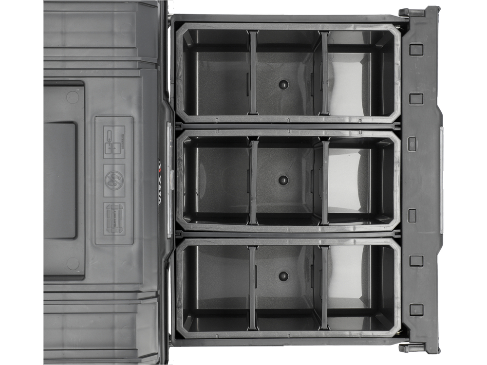 Box se dvěma zásuvkami kombinuje výhody malého boxu a bezpečného organizéru. Zásuvky jsou vybaveny vyjímatelnými přepážkami a kbelíky na drobné předměty. Spodní zásuvka je větší. Lze jej použít k uložení drobných součástek nebo po odstranění přepážek k uložení drobného elektrického nářadí. Různé velikosti zásuvek výrazně zvyšují volnost uspořádání mobilní dílny. Skříňku lze namontovat na pojezdovou plošinu a na skříňku s kolečky ze systému S1 a S12. Díky konektorům jej lze připojit k libovolné součásti systému. Několik spojených boxů na plošině s koly vytvoří mobilní vozík na nářadí. Skříňka má systém zamykání zásuvek, který zabraňuje jejich vysunutí. Zásuvky mají kovová vodítka pro snadné vyjmutí. Konstrukce je vyztužena vnějším žebrováním. Krabičku je možné zavěsit na zeď.