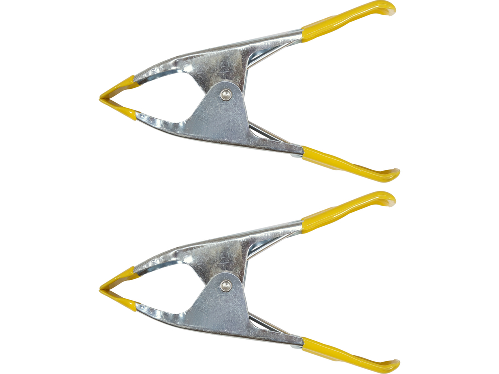 Silné pružinové svorky z pozinkovaného ocelového plechu. Červené vinylem potažené rukojeti a pracovní hroty.