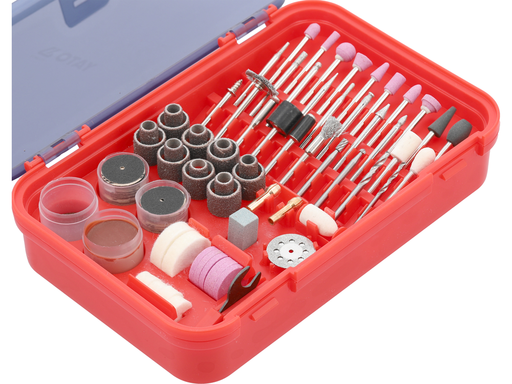 brusný trn 2x (Ø3,2 mm), čep disku (Ø3,2 mm), brusný papír x80, pilový kotouč x2, brousek, HSS fréza x2 (Ø3,2 mm), plsť x4 ((Ø6,3 x 12,7 mm), plsť x2 Ø6,3x25 mm), plstěný,