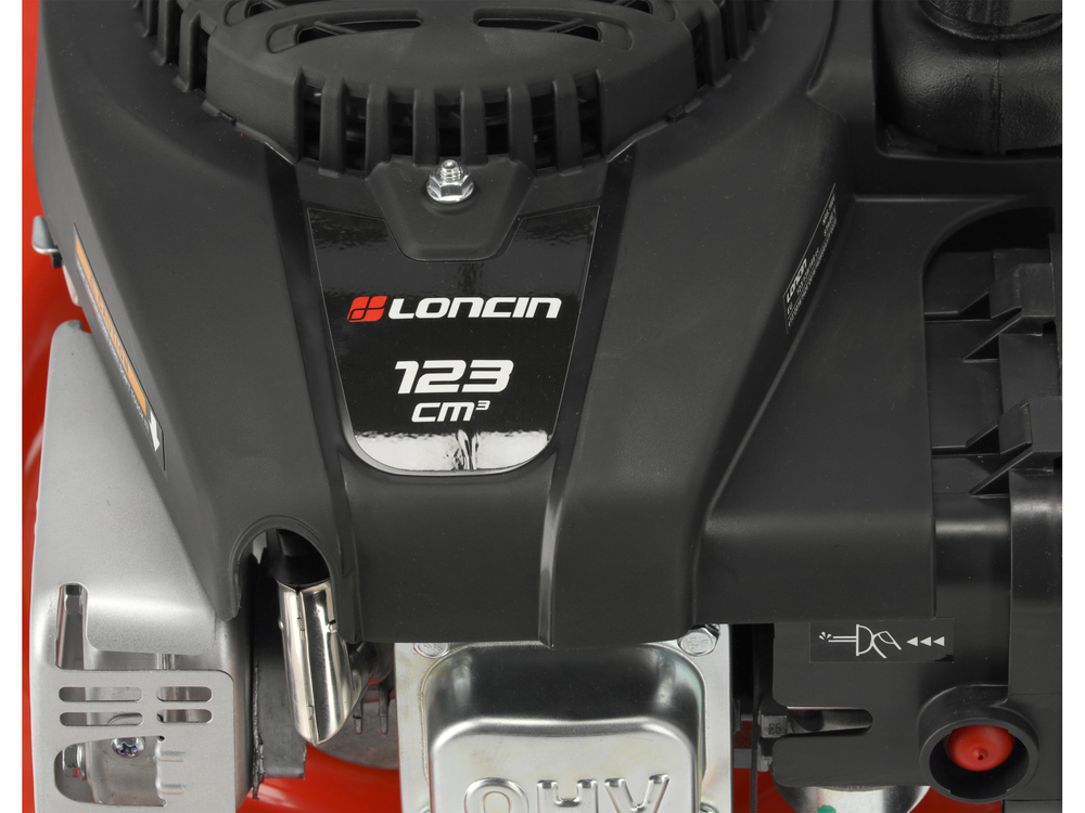 Benzínová sekačka s pohonem vybavená motorem LONCIN o průměru 123 cm3, který zajišťuje vysokou sílu a výkon. Pracovní záběr 41 cm a robustní konstrukce usnadňují sekání trávníku na užších, nerovných a náročných místech, jako jsou svahy, cesty a záhony nebo místa v blízkosti výsadby. Vestavěný pohon zlepšuje manipulaci s jednotkou.