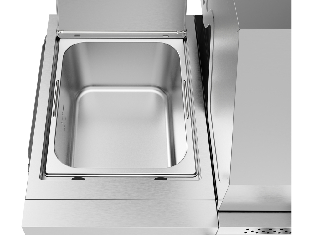 - boční police s vysouvatelnou dřevěnou deskou na krájení a ocelovým kontejnerem pro uložení surovin nebo hotových jídel
