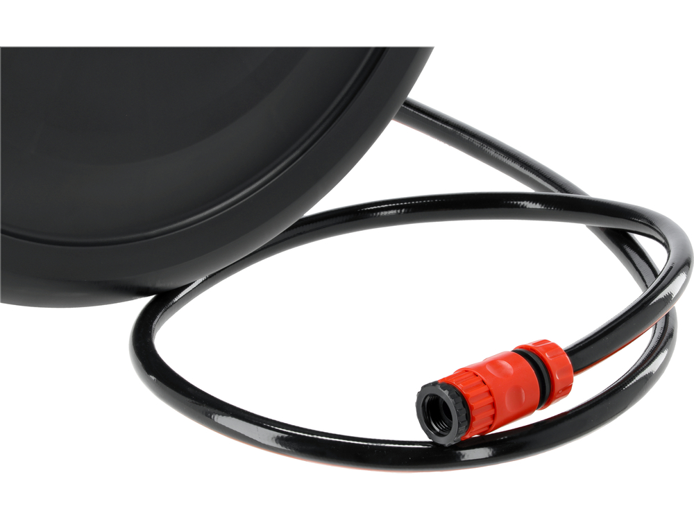 zahradní hadice 1/2" (12,7 mm), 25 m, Vodicí hadice 1/2" (12,7 mm), 2 m, automatický navíječ, upevňovací kotvy x4, Rychlospojka 1/2" (12,7 mm), Rychlospojka 1/2" (12,7 mm) x2,