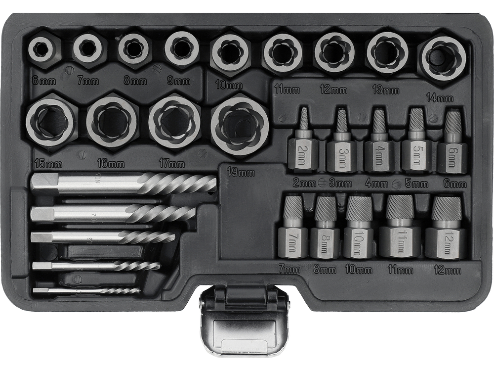 Profesionální sada určená k efektivnímu odstranění poškozených, zapečetěných nebo vytržených šroubů, hřebíků a matice. Osvědčuje se v mechanických servisech, průmyslových dílnách a při montážních pracích. Byla sestavena tak, aby zajistila širokou škálu velikostí a pracovních metod, umožňující obsluhu ocelových a hliníkových prvků s poškozenými hlavami, opotřebovanými závity a zapečetěnými spoji. Jedná se o praktické řešení pro odborníky, kteří očekávají spolehlivost a univerzálnost v jednom balení.