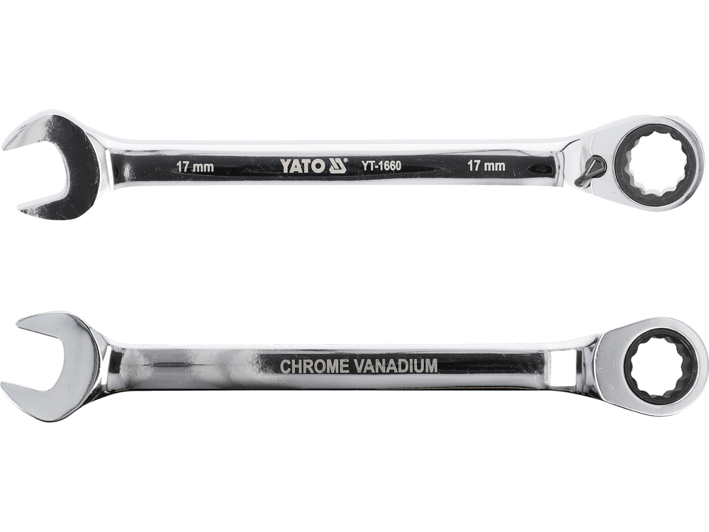 Flat-end wrench with ratchet and direction switch. Designed for automotive workshops and service shops.