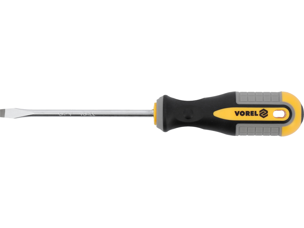 - Wkrętak płaski 5x100 mm marki Vorel 60954. Wykonany ze stali chromowo-wanadowej CrV.