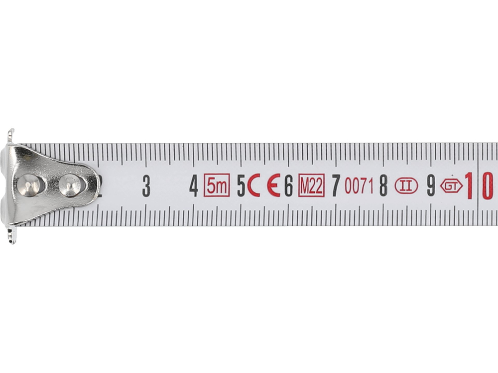 Tape in white with legibly applied millimeter graduation, made of resilient steel sheet with a width of 19 mm. Surface protected by a nylon coating to protect the tape from abrasion and discoloration under sunlight.