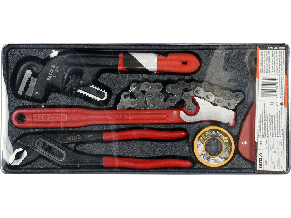 off-set pipe wrench (10" / 250 mm), pipe chain wrench (300 mm), adjustable wrench (250 mm), pipe cutter (3-32 mm), PTFE tape for thread sealing (10 m x 12 mm)More