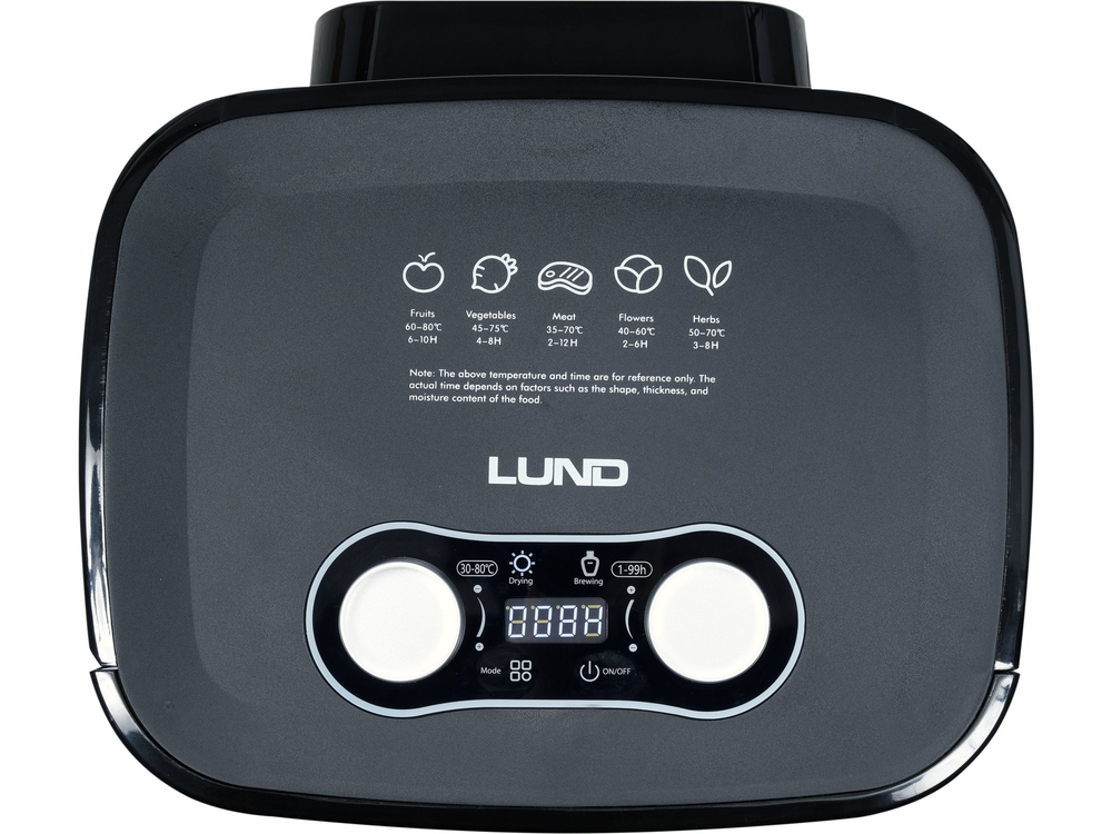 Food dryer for drying fruits, mushrooms, vegetables, flowers, herbs and meats. High efficiency with low energy consumption. Drying in the temperature range: 30-80 ℃. Set time and temperature with convenient dials.