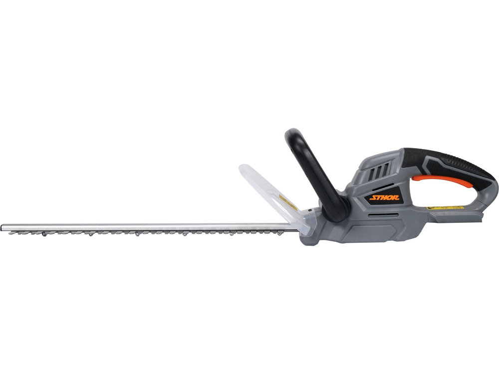 Cordless hedge trimmer powered by a 20-volt Sthor platform battery. The shears give the user the pleasure of quiet operation and the freedom to manoeuvre without a cumbersome extension cord. The high speed of the cutting blades makes it much easier to work with fresh shoots and branches up to 14 mm thick. Hardened blade, made of 65Mn steel. The soft rubberised grip provides a secure hold on the tool while working. A two-hand safety switch protects against accidental start-up.