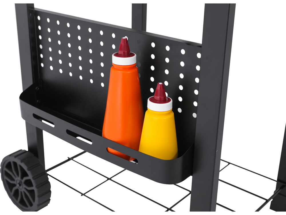 The grill is equipped with an enameled grate with a surface area of 47 x 37 cm and an enameled warming rack of 40 x 13 cm.