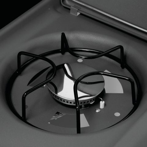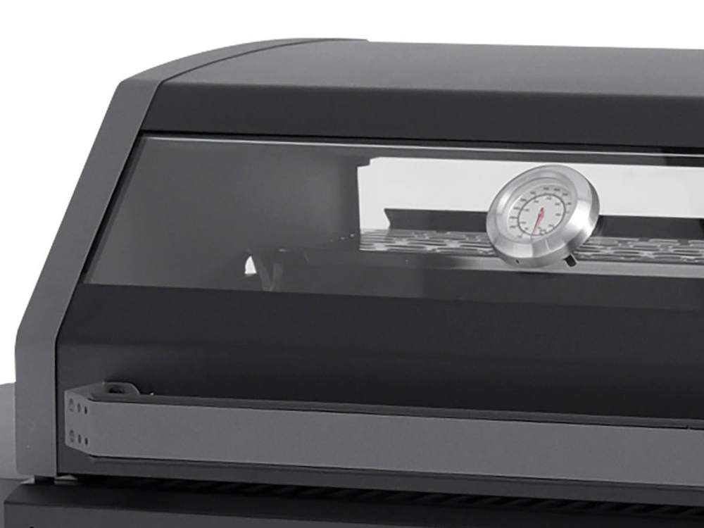Freestanding gas barbecue for preparing food outdoors. Equipped with four main burners with a total output of 12 kW and a side burner of 2.2 kW. The glass in the lid makes it easy to supervise the grilled food.