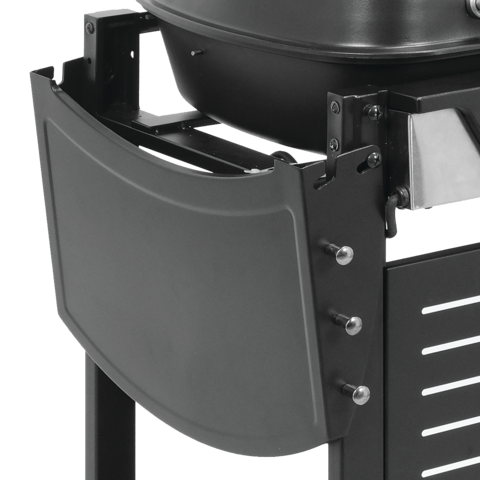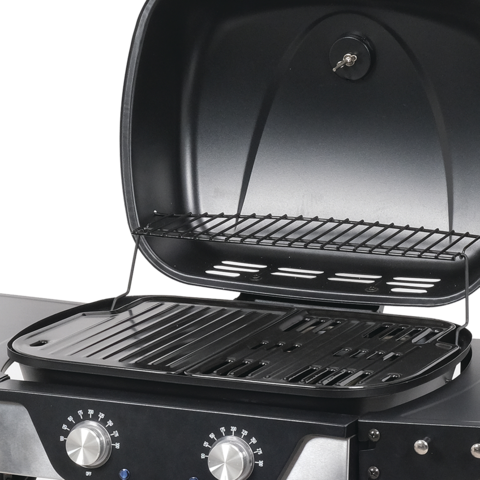 Freestanding electric grill for outdoor cooking. Grill zone divided into two hotplates (solid and fat-hole plate). The operating temperature of the heaters for each plate independently adjustable by a knob.