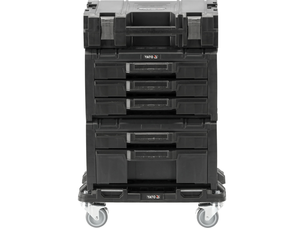 The four-piece set is a mobile workshop, workshop trolley or multifunctional cabinet. Consists of a wheeled platform (P05 S12), a two-drawer box (T2 S12), a three-drawer box (T3 S12) and a universal power tool box (41G2 S12). The robust construction allows boxes with a maximum weight of 100 kg to be transported. Metal swivel wheels equipped with a brake ensure excellent manoeuvrability of the entire squad. The second part of the set consists of a box with two drawers equipped with dividers and buckets. It combines the advantages of a small box and a secure organiser. The third module is a box with three drawers equipped with dividers and buckets. The fourth, top element is a compact container fitted with two layers of protective sponge. Its purpose is to safely store power tools, valuable measuring and diagnostic tools.