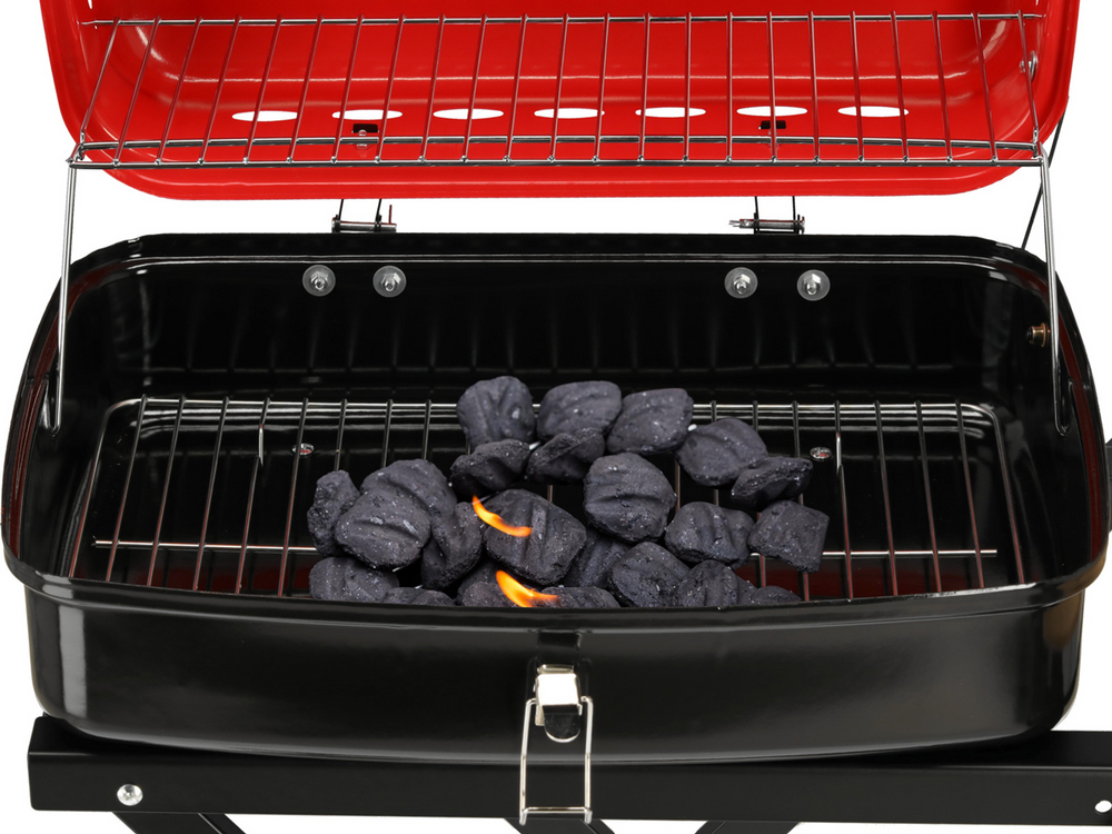 Charcoal grill with a steel hearth and chrome-plated grate, whose large surface area makes it possible to grill several ingredients at the same time.
