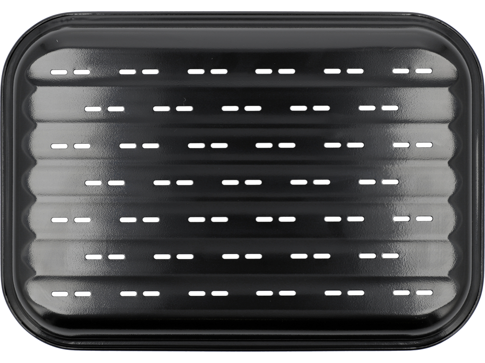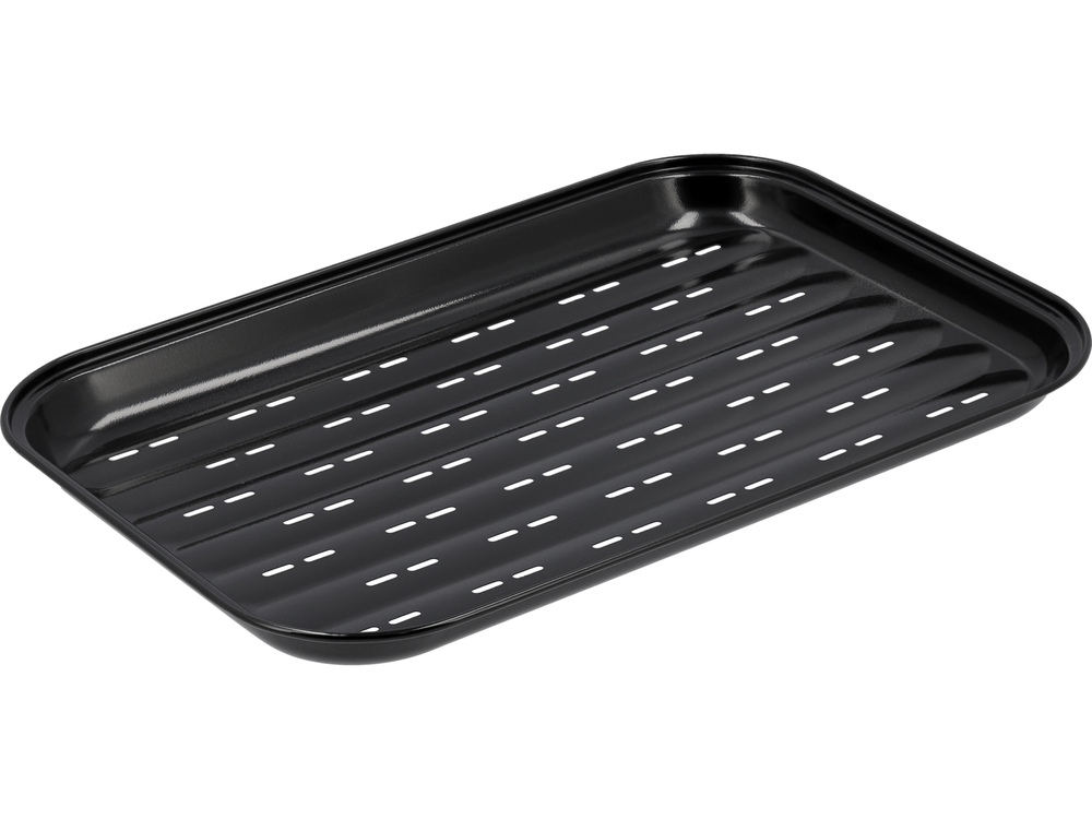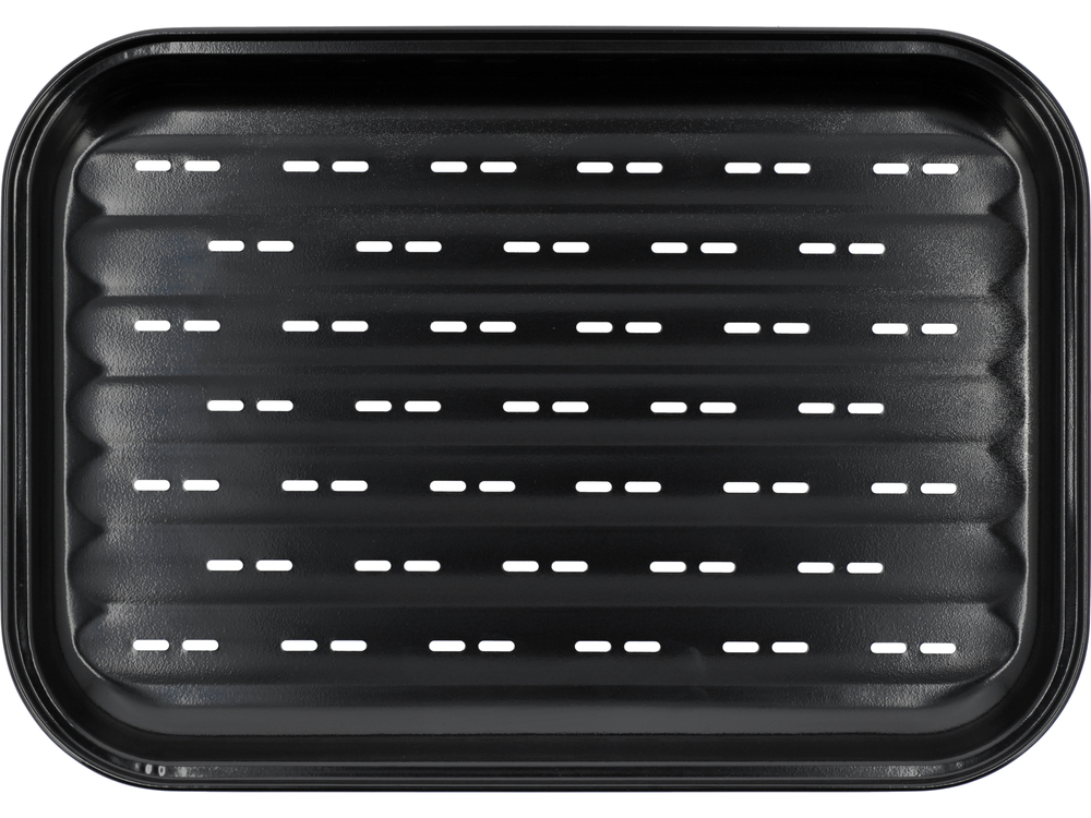 Three steel, ribbed grill trays with a non-stick coating. Unlike disposable aluminum trays, the non-stick grill pan is reusable and does not emit harmful substances under high temperatures. It is a healthier, more environmentally friendly alternative that allows you to enjoy the taste of grilled dishes without compromise.