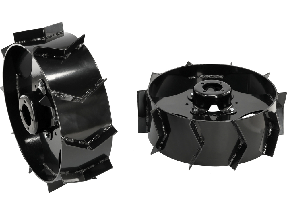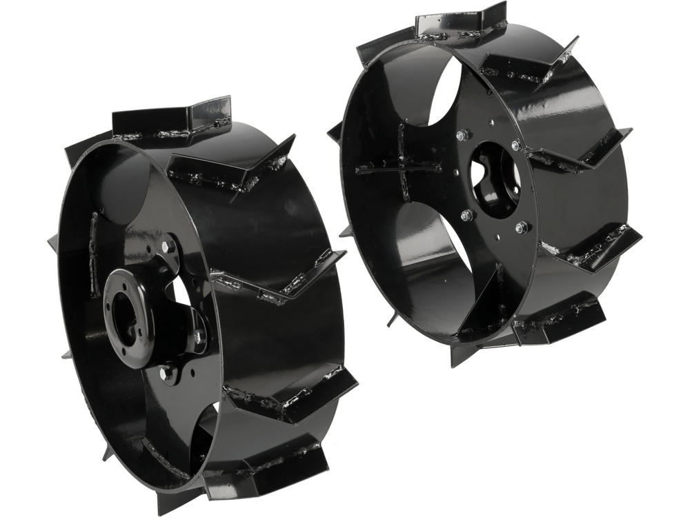 Metal wheels are essential equipment for users of single-axle tractors YT-85850 and YT-85851, who need increased traction when working in the soil, especially when plowing. Thanks to their solid construction and specially designed tread, they provide effective traction, even in difficult terrain conditions.