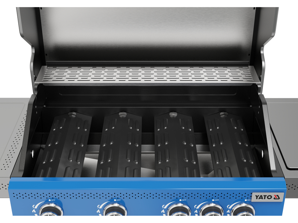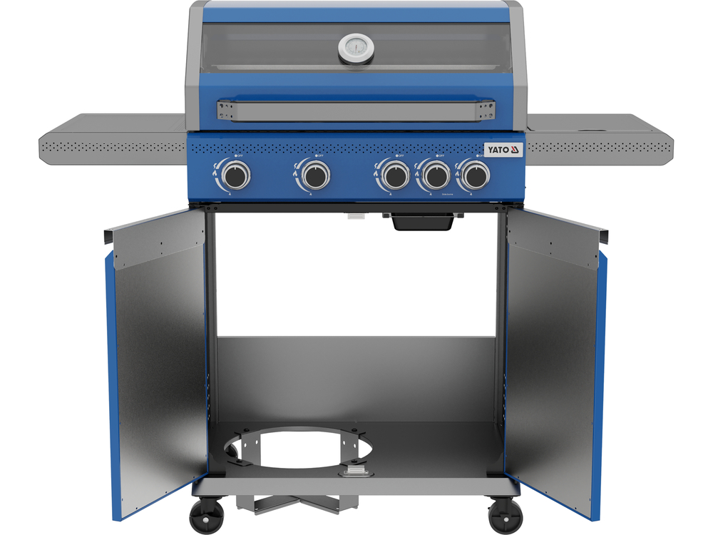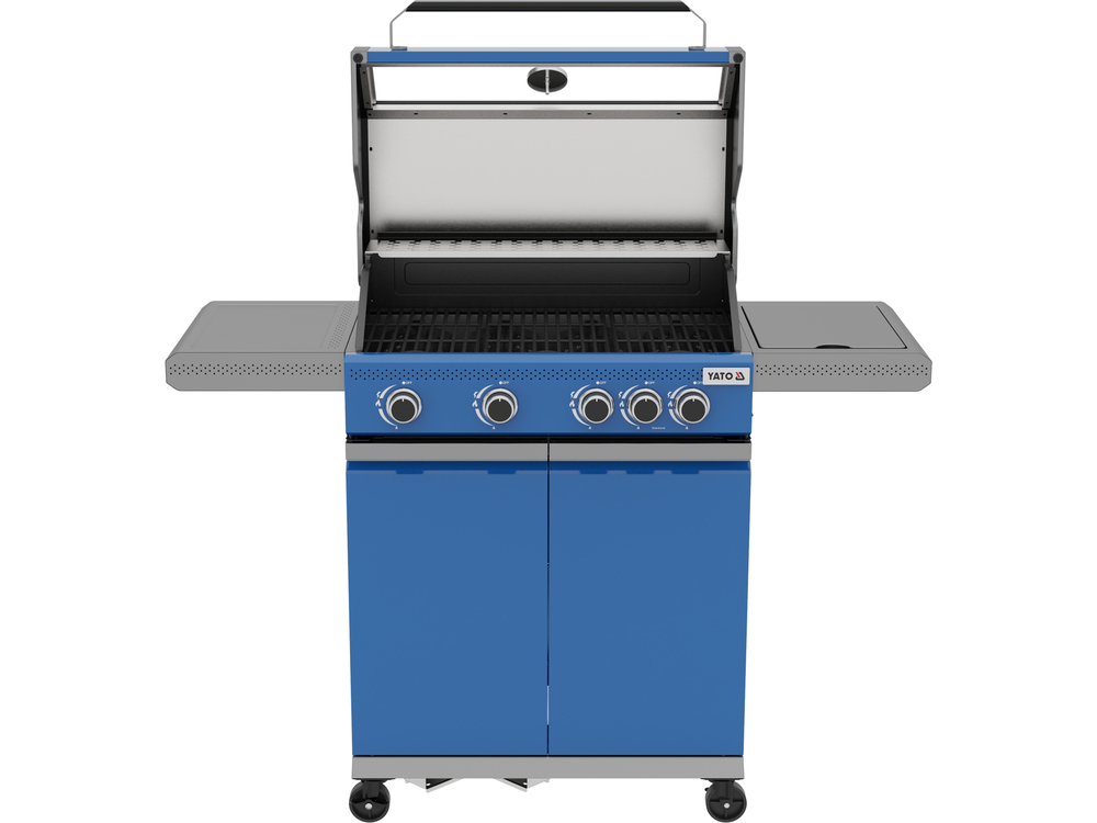 Modern 4 + 1 gas grill from the YATO Itami series in a unique blue color. Equipped with a reliable cast iron grate with a surface area of 68 x 42 cm and a stainless steel warming rack. The total power of the burners is 14.2 kW. Side shelves and a spacious, lockable cabinet make it easy to store spices and necessary accessories.