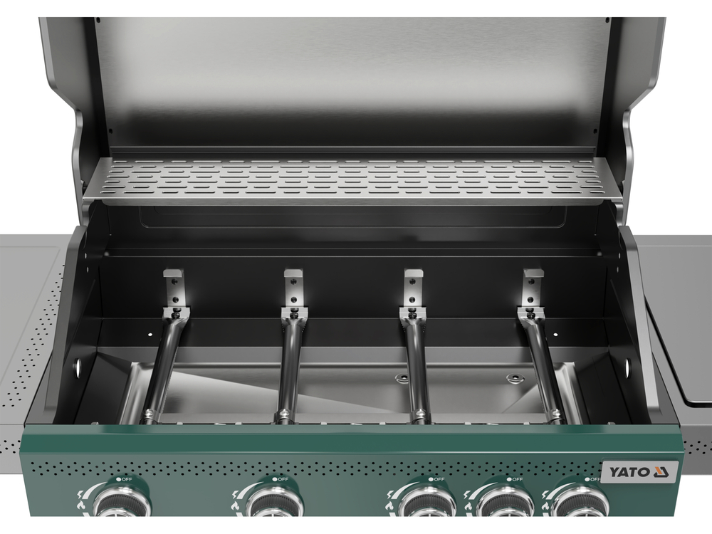 Modern 4 + 1 gas grill from the YATO Itami series in a unique green-grey color. Equipped with a reliable, cast iron grate with a surface of 68 x 42 cm and a stainless steel warming rack. The total power of the burners is 14.2 kW. Side shelves and a spacious, lockable cabinet make it easy to store spices and necessary accessories.