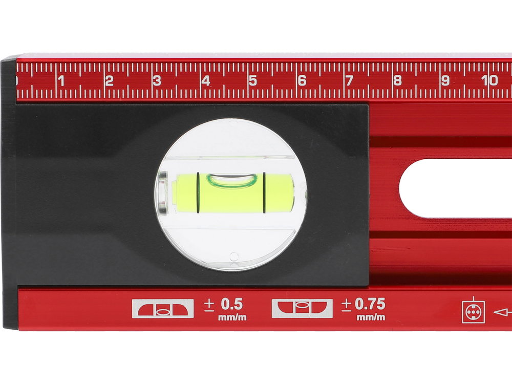 Level for electricians allowing for quick and precise measurement, leveling, and marking. It enables transferring and marking distances using marking sliders on the measuring scale.