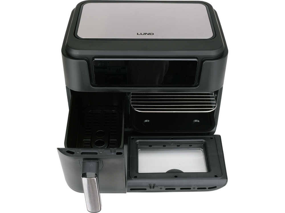 A multifunctional, oil-free fryer with two separate bowls is a practical device that can replace several kitchen appliances, allowing you to prepare healthy and quick meals for the whole family and guests. It has a non-stick coating, thanks to which a little fat or its complete elimination is enough to prepare tasty and aromatic dishes. It allows for defrosting, reheating, baking, frying, and grilling vegetables, meats, fish, as well as sweet and savory pastries.