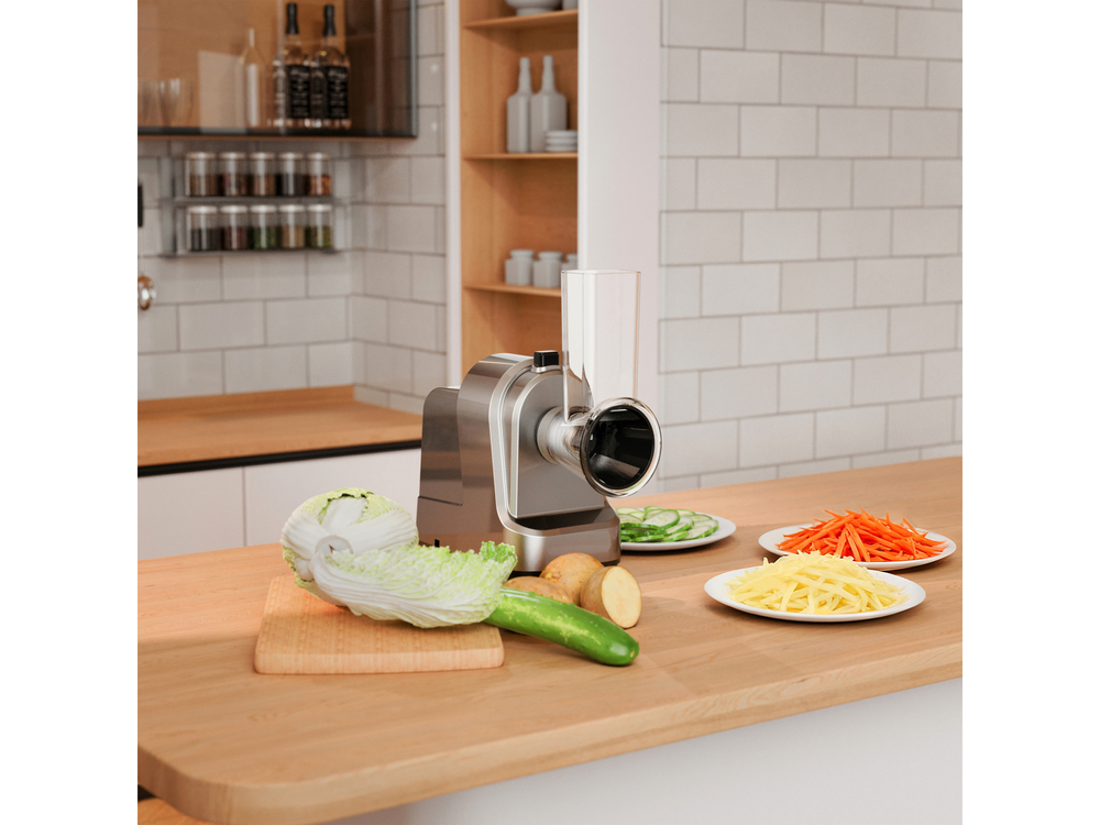 An electric slicer with a power of 250 W is a practical device that significantly facilitates daily meal preparation. It quickly and evenly slices vegetables into slices or shavings, helping in the creation of fresh salads, coleslaws, and side dishes for dinner. Five interchangeable drums with stainless steel blades ensure precise cutting of raw and cooked vegetables of various thicknesses.