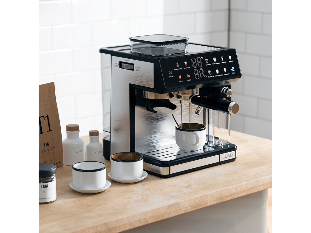The LUND 68501 pressure espresso machine with a burr grinder and milk frother is a combination of modern steel design with functionality. It offers 11 automatic programs, allowing you to prepare both classic espresso and milk-based specialties - quickly, conveniently, and always with repeatable results. The colorful, touch control panel makes drink selection and device operation quick and intuitive, while the Thermoblock system and 20 bar pump ensure stable extraction and quick readiness for work. Additionally, the espresso machine is equipped with an automatic cleaning program and large, easy-to-clean water and milk tanks, simplifying daily operation.