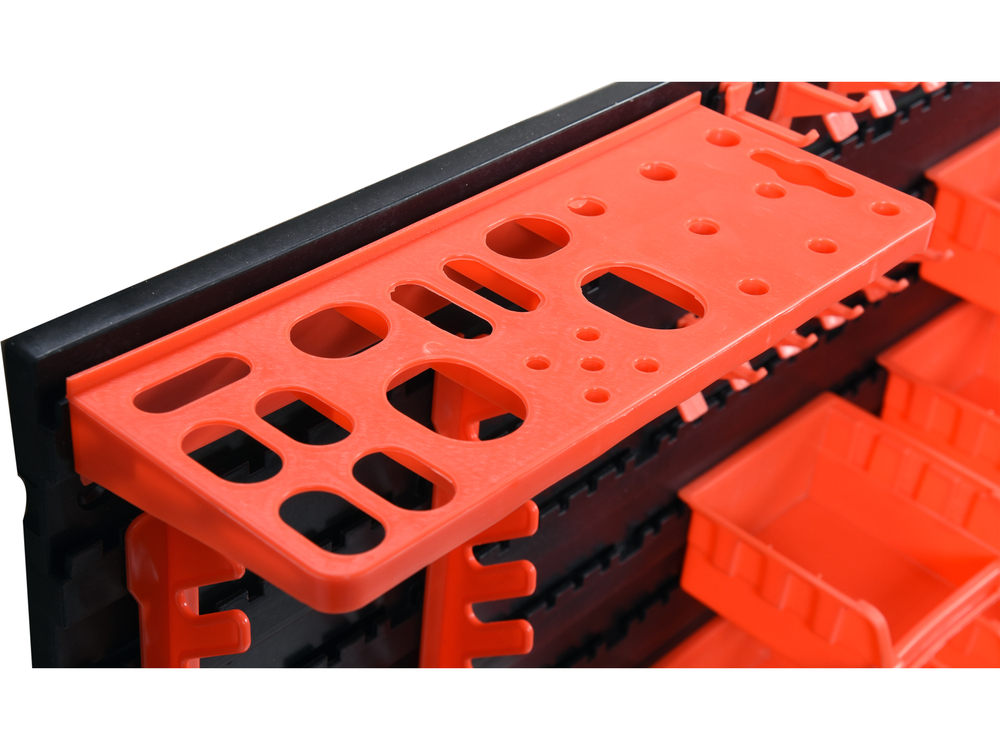 Une planche pour le rangement pratique des outils et des petits accessoires dans l'atelier et le garage. Il permet de garder les choses en ordre et le système de bacs et de cintres peut être facilement adapté à vos besoins.