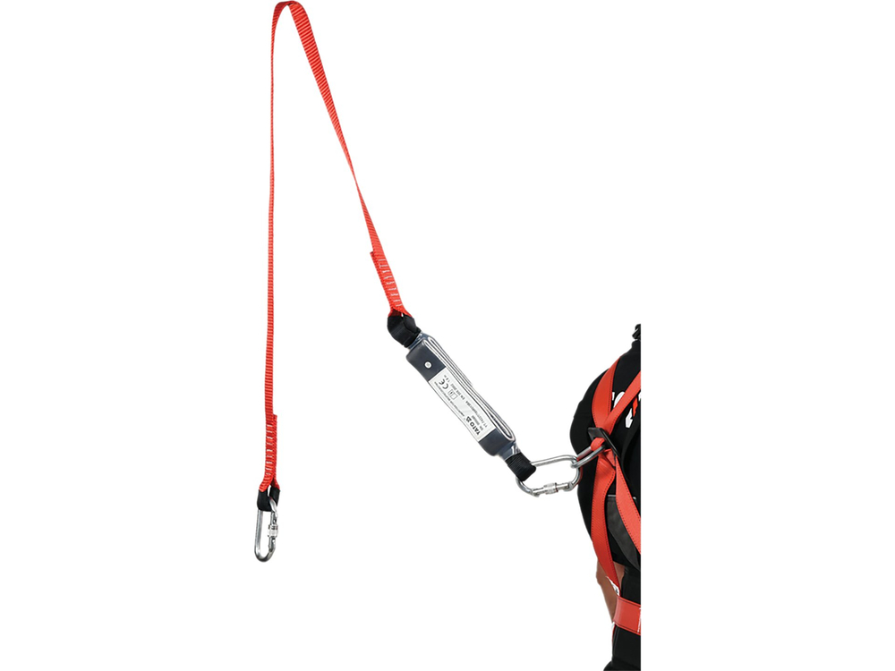 Le harnais et l'amortisseur YT-74235 sont des composants d'un système conçu pour protéger les personnes contre les chutes de hauteur. Le harnais, lorsqu'il est porté correctement, doit être bien ajusté autour du torse et des cuisses afin de répartir les forces agissant sur le corps lors d'une chute, ainsi qu'un point d'ancrage dédié. L'absorbeur de chocs, grâce à une sangle en polyester cousue de manière appropriée, se déroule progressivement lors de l'arrêt de la chute, ralentissant ainsi la vitesse de celle-ci. L'absorbeur de chocs relie le harnais au point d'ancrage.