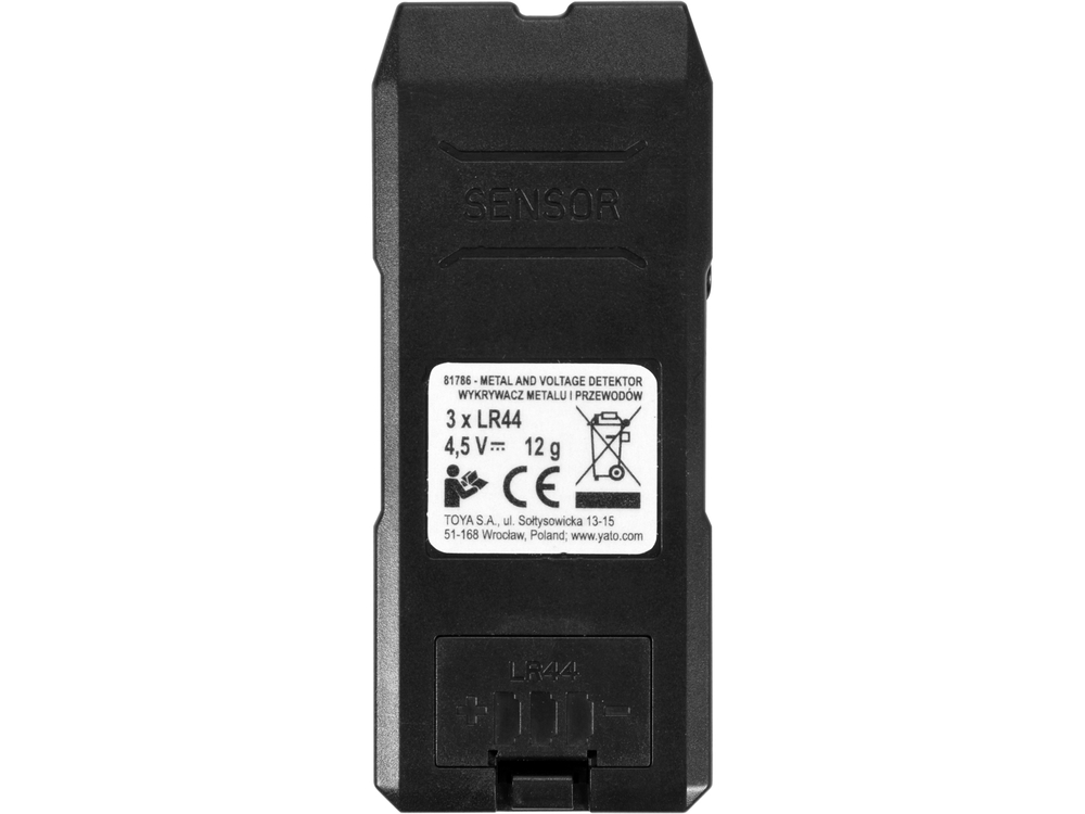 Le détecteur est équipé d'un signal sonore et de deux LED pour indiquer la détection du matériau. Il est très facile à utiliser et ses petites dimensions [mm] 90 x 38 x 20,5 et son poids de 48 g permettent de le ranger sans problème. Le détecteur est alimenté par 3 piles de 1,5 V (LR44).