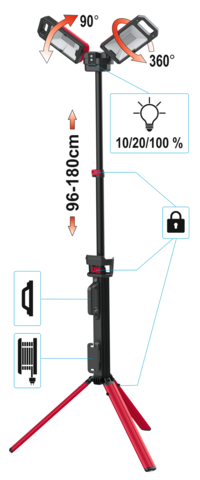 Lampe frontalepliante YATO à batterie avec une puissance maximale de 5000 lm. Avec trois modes de fonctionnement et deux couleurs de lumière, vous pouvez adapter l'éclairage à vos activités et à votre niveau de batterie. La puissante batterie lithium-ion 7,2 V 4000 mAh offre une autonomie de 1 à 5 heures, et un fonctionnement continu est possible dans les zones disposant d'un accès au secteur. Les angles d'éclairage et la hauteur du trépied sont également réglables.