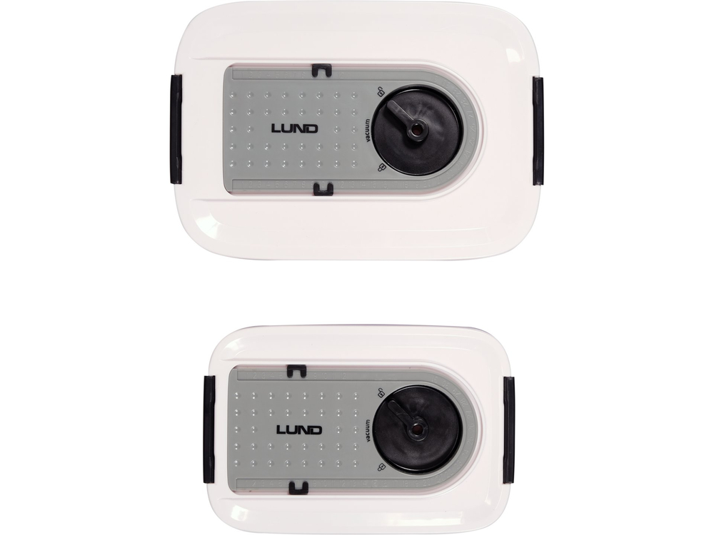 Lot de deux récipients sous vide de la marque LUND d'une capacité de 0,75 litre et de 1,5 litre. Le matériau de haute qualité garantit la durabilité, la possibilité de réchauffer les aliments au micro-ondes et de laver l'emballage au lave-vaisselle. Un avantage supplémentaire est la possibilité de marquer la date sur le couvercle.