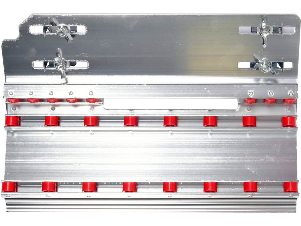 Le corps du guide est en aluminium et équipé de rouleaux en plastique pour faciliter le glissement sur le carreau chanfreiné.