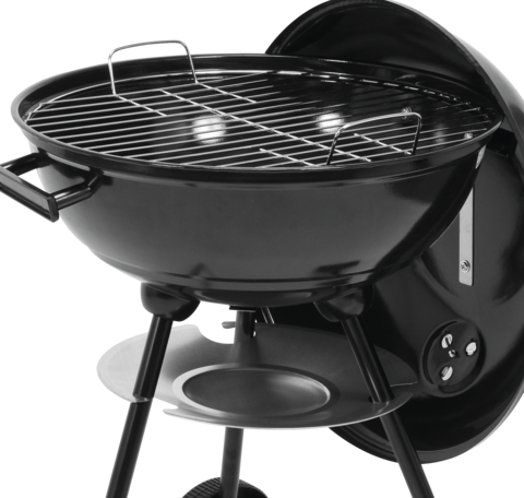 Barbecue rond classique au charbon de bois avec grille chromée et couvercle à maintien de température. Équipé d'une grille à charbon, d'un bac à cendres, de roulettes de transport et d'une ouverture pour contrôler la circulation de l'air. Le couvercle émaillé avec poignée permet de maintenir et de contrôler la température et de conserver l'arôme de la fumée. Grâce au crochet intégré au couvercle, il est possible de le suspendre sur le côté de la cuvette.