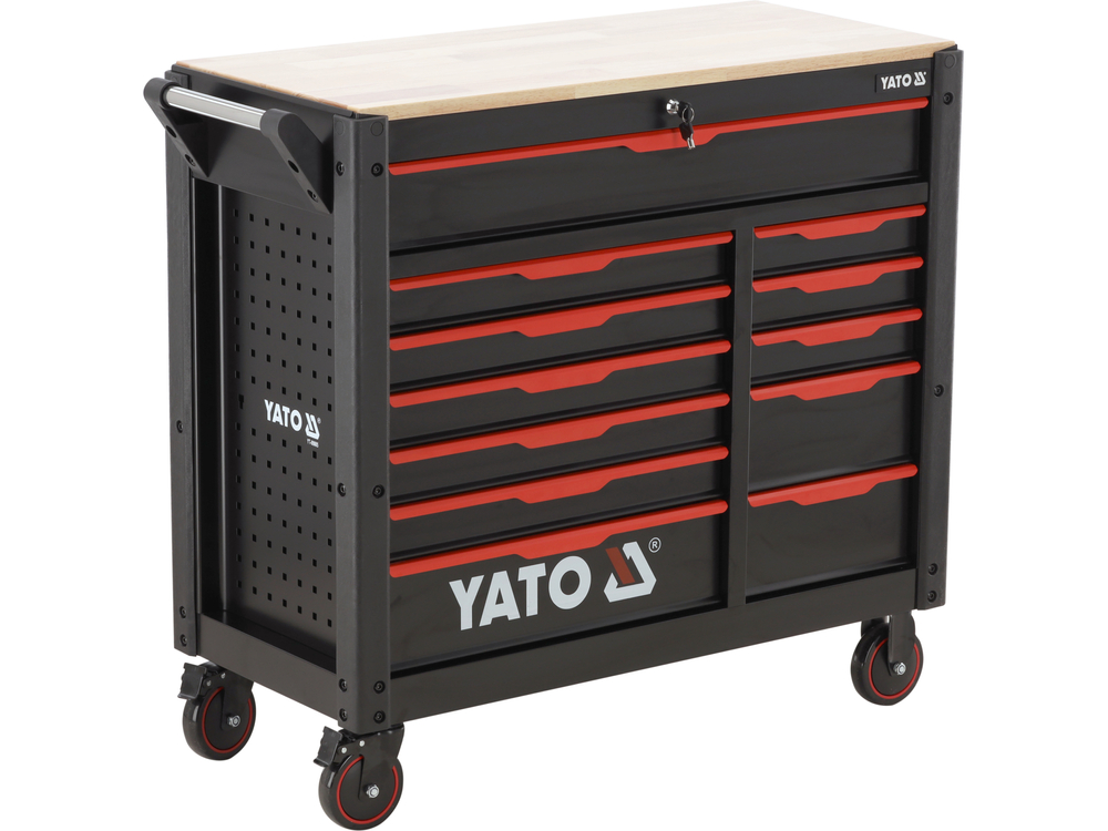 Armoire de service à 12 tiroirs, conçue pour les garages et les stations-service. Plan de travail en bois de caoutchouc. La perforation universelle permet d'équiper l'armoire ultérieurement. Les butoirs d'angle protègent contre les dommages accidentels, par exemple sur la carrosserie.
