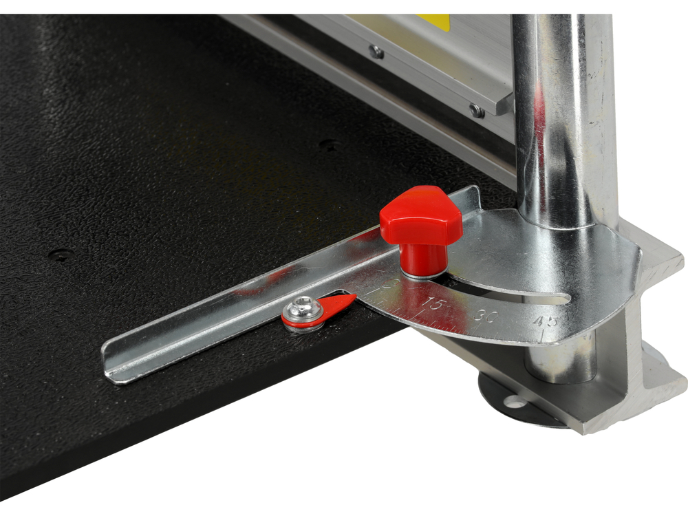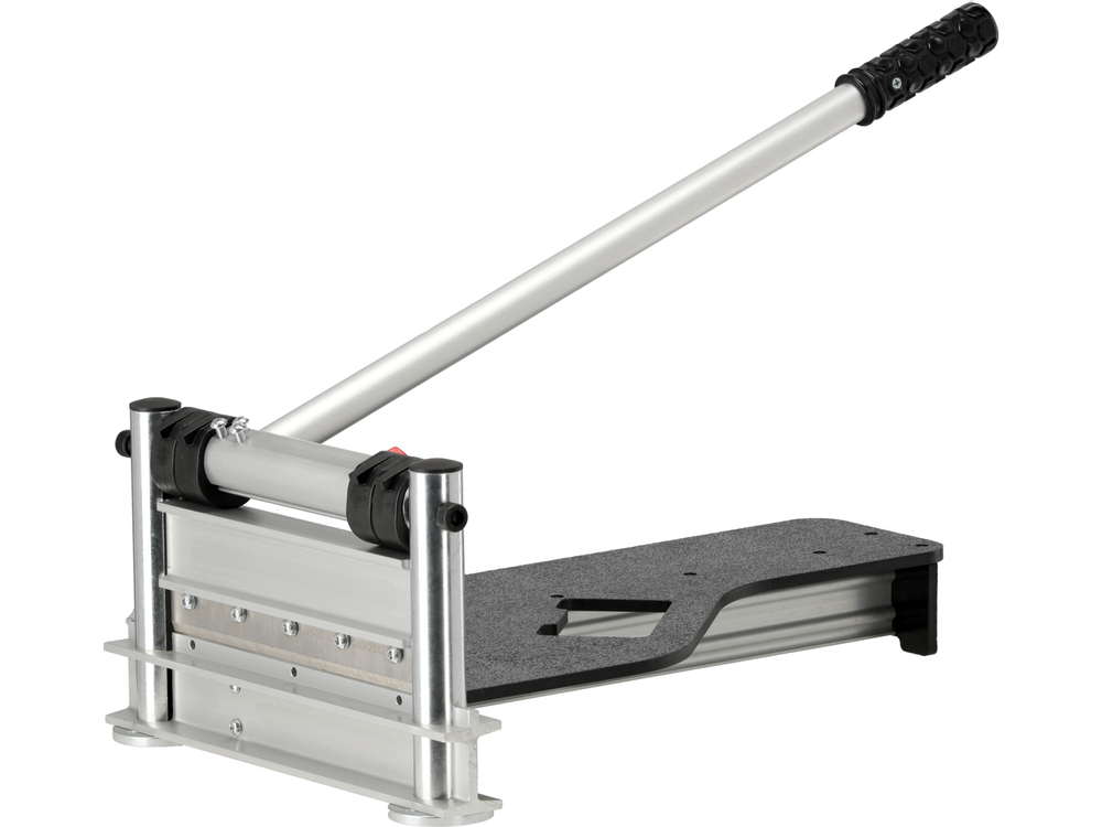 Guillotine pour la découpe de panneaux de sol, d'une largeur de coupe de 230 mm et d'une épaisseur maximale de 15 mm. La lame de la guillotine est fixée dans des profilés en aluminium, montés sur des socles verticaux en acier. Le bras de serrage mesure environ 650 mm de long. La surface de travail est en plastique dur et résistant à l'usure et mesure 460 mm x 650 mm. Un biseau est intégré dans la partie supérieure pour permettre la coupe à des angles de 15°, 22,5°, 30° et 45°.